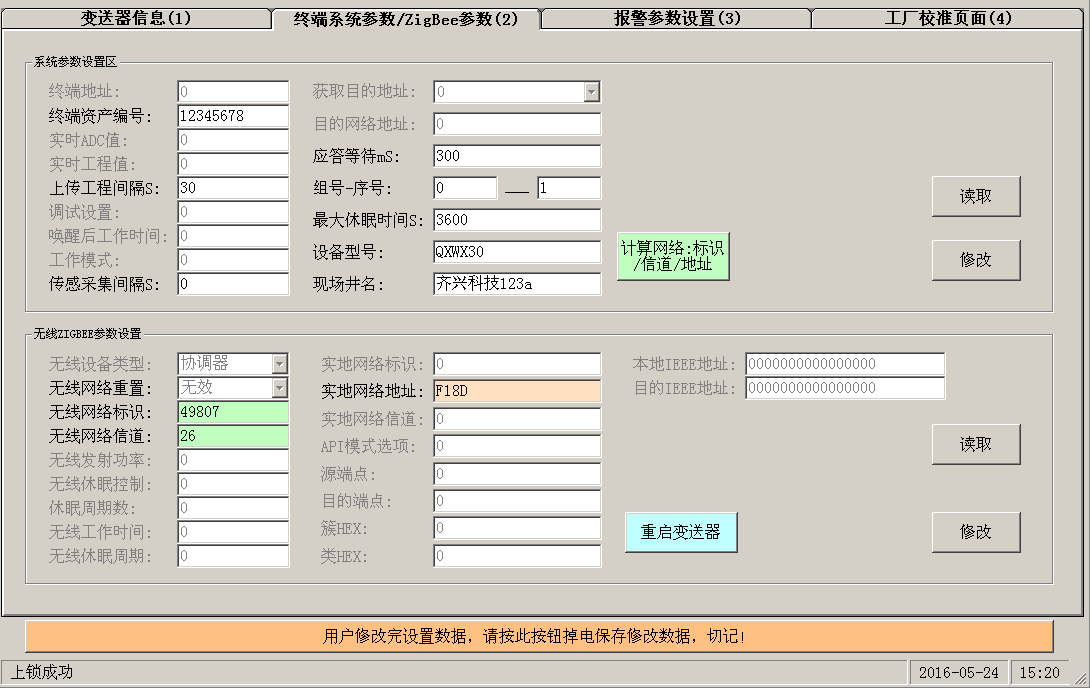 此頁面主要設置變送器的采集,上傳間隔,間隔時間,ZIGBEE網絡的網絡號,信道號,以及現場井名,還有根據井名稱生成網絡參數。所有參數設置完須執行寫入操作,寫入操作完畢之后須用戶保存參數。網絡參數設置完須重啟變送器才可以啟用本次設定的無線參數。