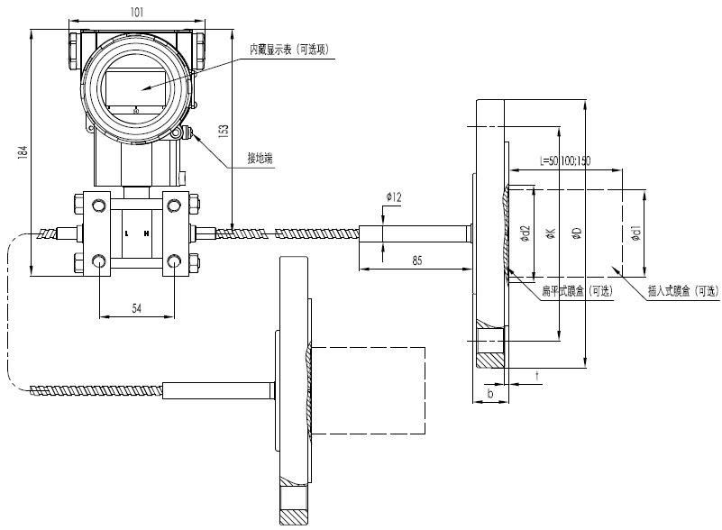 TX3351-DR差壓遠傳變送器的膜盒是用于防止管道內介質直接進入差壓變送器的壓力傳感器組件中,它與變送器之間采用硅油等填充液傳遞壓力。